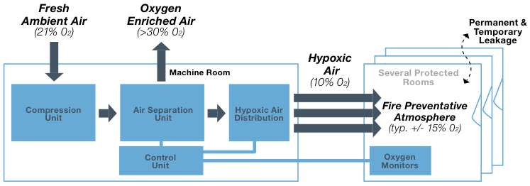 - The entire room is ventilated with low oxygen air, inhibiting fire ignition.